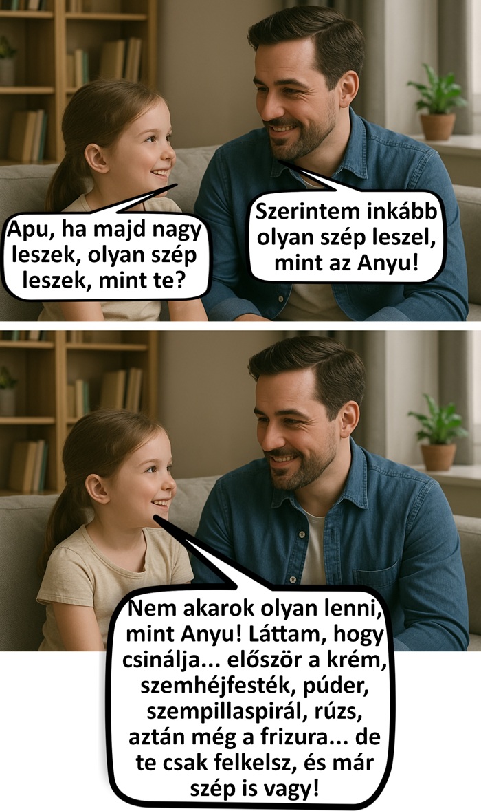 12. A kislány hosszú megfigyelések alapján levonta a következtetéseket, és arra jutott, hogy az apukájára szeretne hasonlítani.