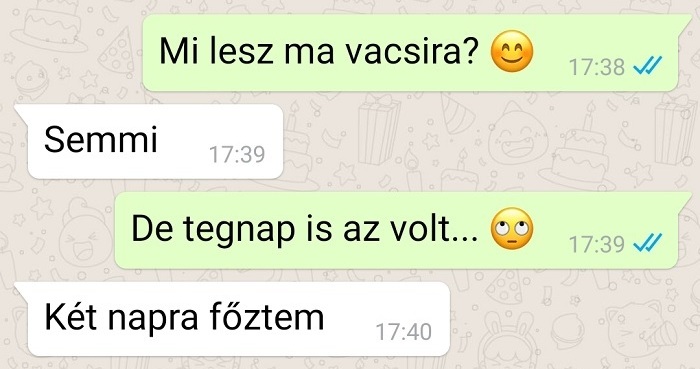 11. A férj túl egyhangúnak találta az otthoni kosztot, de a feleségét ez nem igazán hatotta meg. A férj kénytelen azt enni, ami van. Vagyis ami nincs...