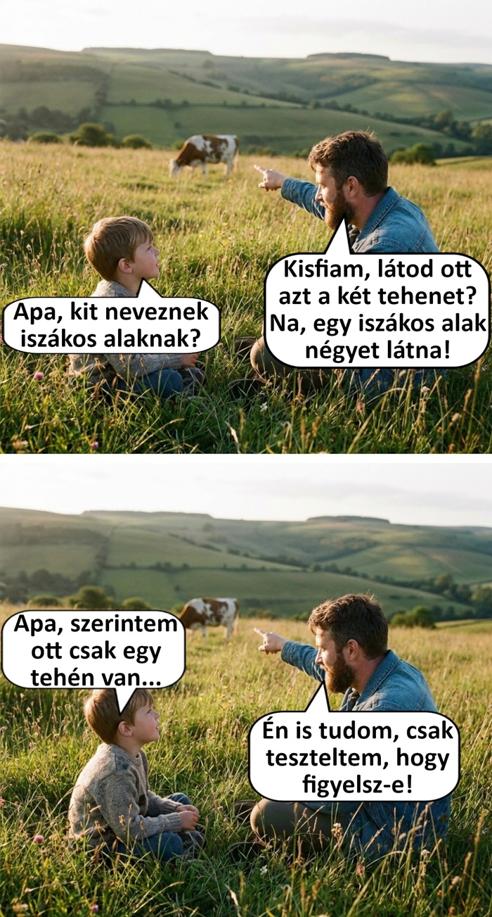 13. Idilli hangulat: egy mezőn apa és fia beszélgetnek, a nap süt, a távolban egy tehén legelészik békésen. Mégis hogyan vehetne ez komikus fordulatot? Nos, egy kíváncsi gyerek kérdésével.