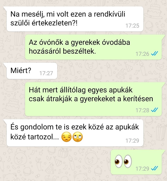 11. Szülői értekezletet tartottak azoknak az apukáknak, akik reggelente óvodába viszik a gyerekeiket.