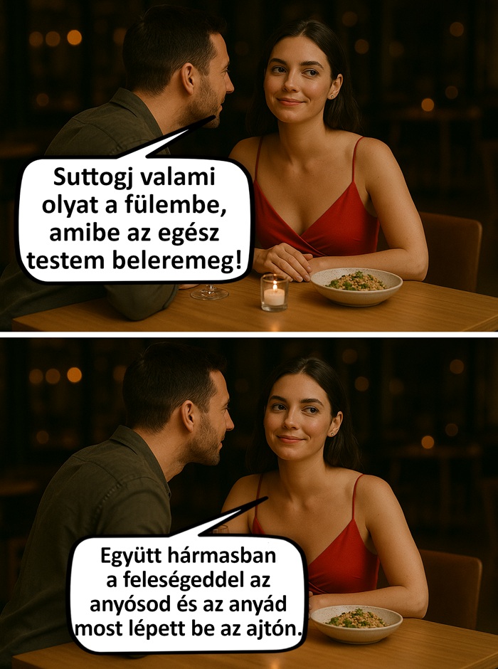 Vacsora közben rákérdeztem, hogy mi van a táskában, mire azt válaszolta, hogy a ruhái, ugyanis úgy gondolta, hogy ha jól sül el randink, akkor azonnal hozzám is költözik.