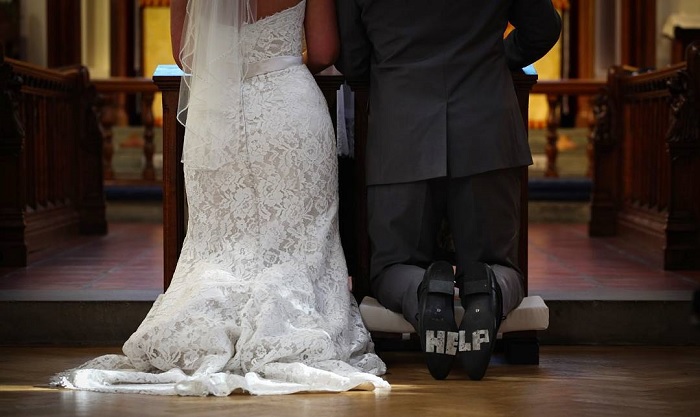 13. Nem értettem, hogy a vendégek miért kuncognak az esküvőnkön, aztán a fotókról kiderült, hogy a férjem a cipőtalpára írt üzenettel próbált segítséget kérni tőlük.