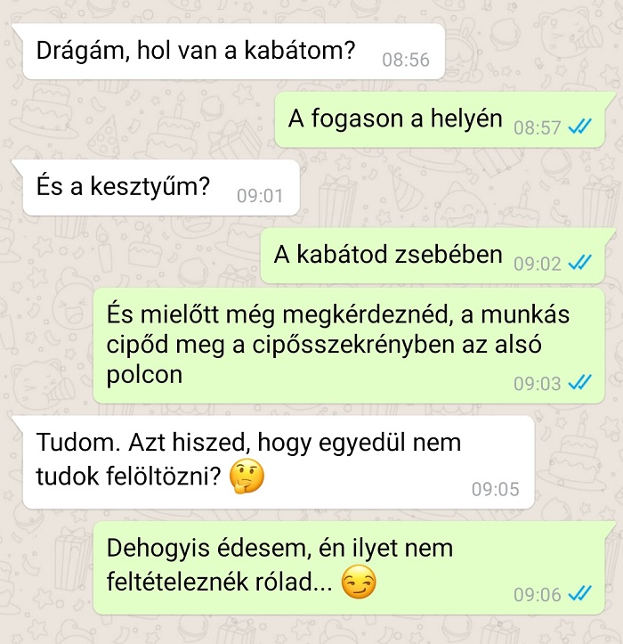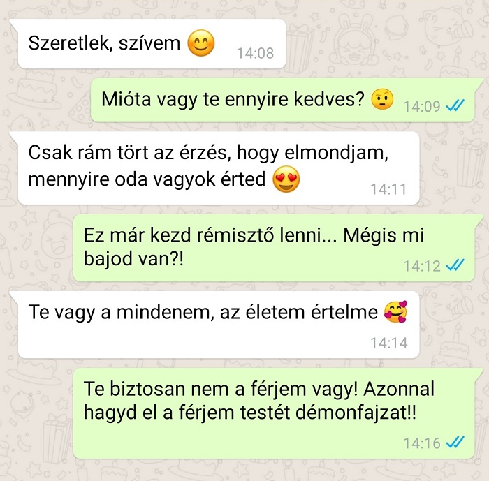 6. Annyira szokatlan a férjétől az ilyesféle megnyilvánulás, hogy nem tudja mire vélni a dolgot.