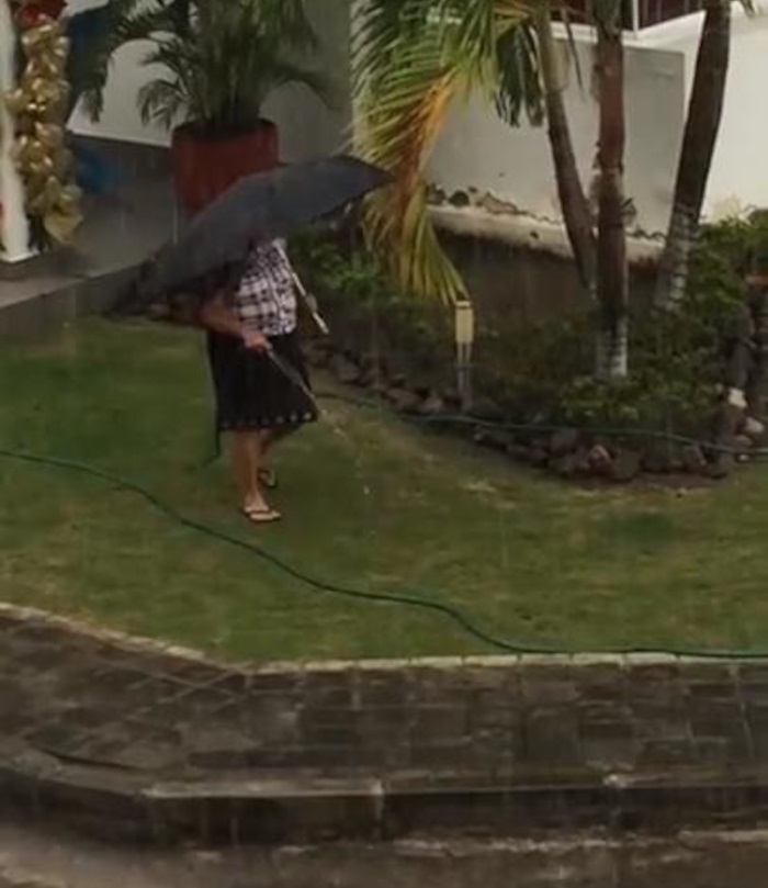 12. Ez a nő elkezdte locsolni az udvarán a pázsitot, ám közben eleredt az eső. Ekkor beszaladt egy esernyőért és folytatta a locsolást, mintha mi sem lenne természetesebb.