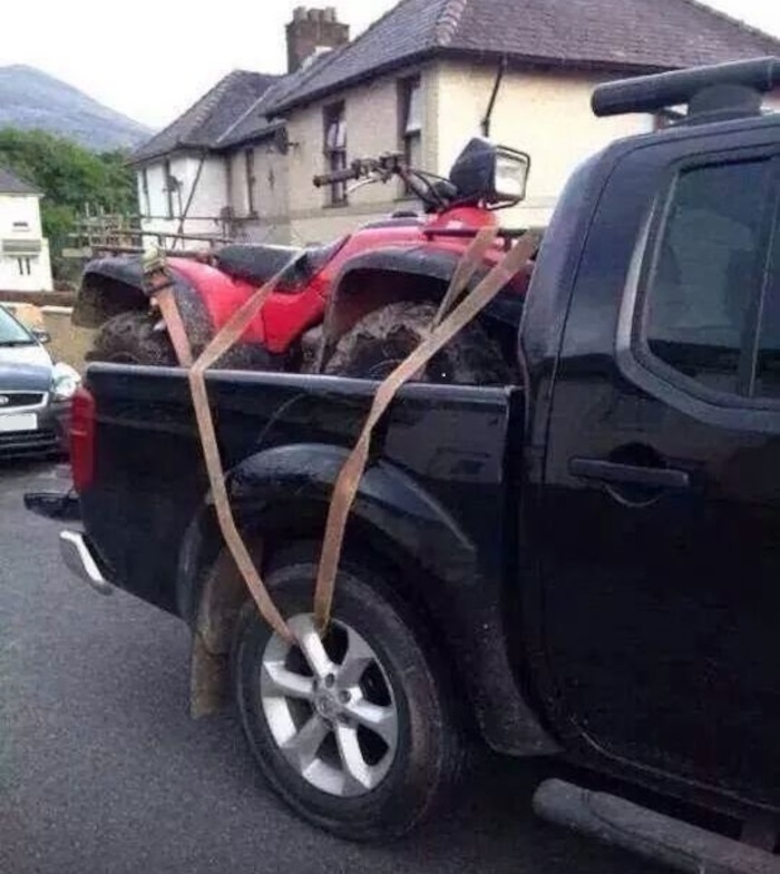 2. A szomszédom így rögzítette a quadját a terepjáró platójára. Ha nehezen is, de végül sikerült meggyőznöm mielőtt még elindult volna, hogy ez így nem lesz jó.