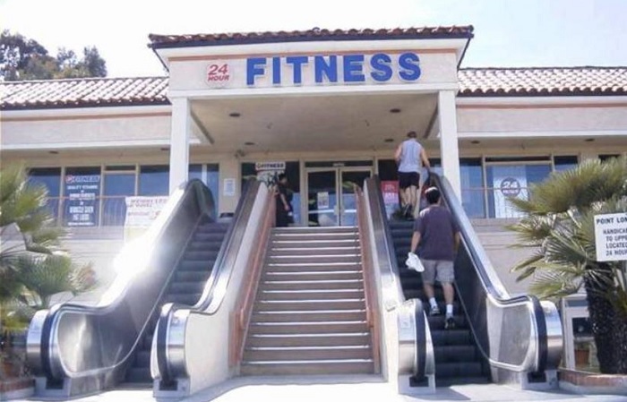 4. Van azért abban némi irónia, hogy egy edzőterem mozgólépcsőt szerel fel a bejárat elé, és a sportolni igyekvő vendégek azt használják a sima lépcső helyet.