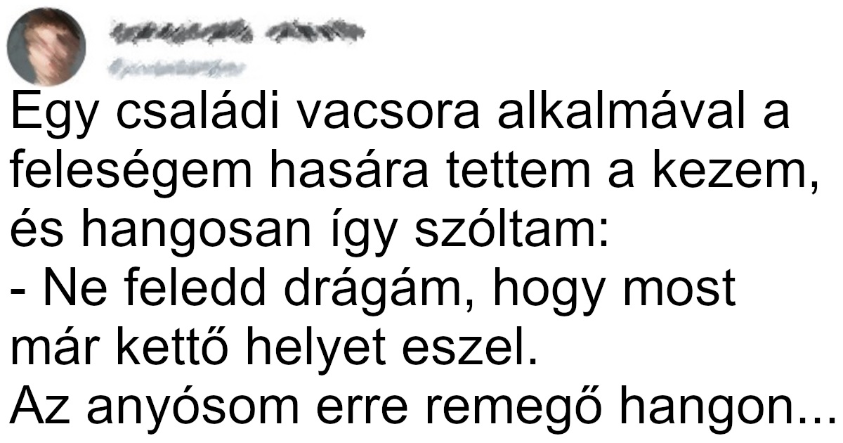 (14) Egy családi vacsora alkalmával a feleségem hasára tettem a kezem, és hangosan így szóltam: Ne feledd drágám, hogy most már kettő helyet eszel.