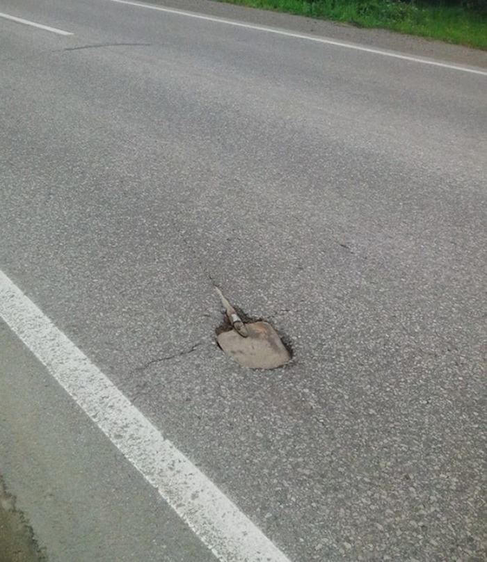11. Aszfaltozáskor valaki annyira belemerült a munkába, hogy még azt sem vette észre, hogy nincs meg a lapátja.
