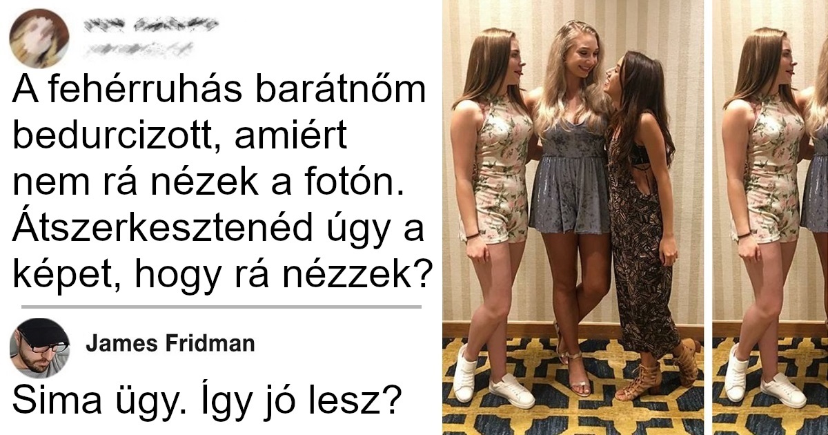 (15) A fehérruhás barátnőm bedurcizott, amiért nem rá nézek a fotón. Átszerkesztenéd úgy a képet, hogy rá nézzek?