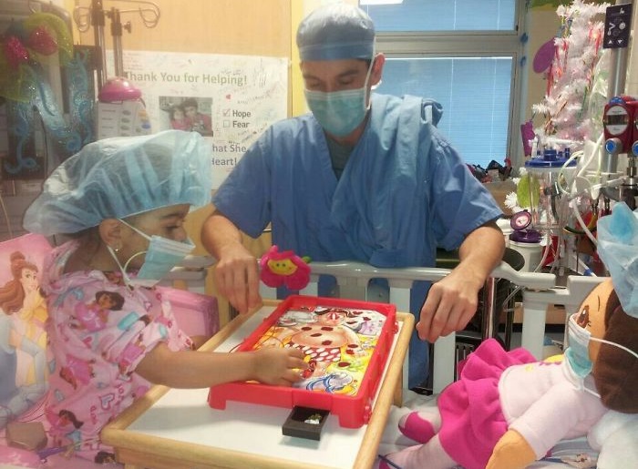 3. Az orvos operációs társasjátékozik a kislányunkkal az igazi műtét előtt.