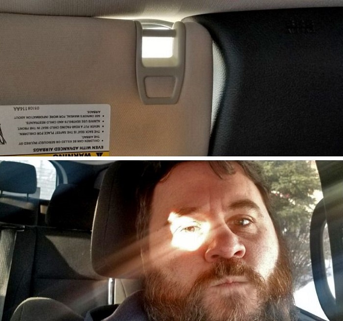 7. A szemembe sütött a nap a kocsiban, ezért lehajtottam a napellenzőt. Ez a kép mindent elmond arról, hogy úgy általában mekkora szerencsém szokott lenni az életben.