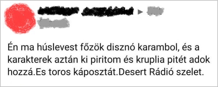 4. Próbáltuk megfejteni a teljes menüsort, de nem jártunk sikerrel. Mindenesetre a disznó karambol és desszertnek egy rádió azért elég jól hangzik.