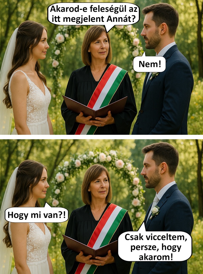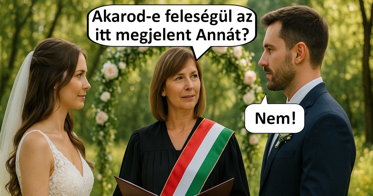 19. Amikor az esküvőn elhangzott a nagy kérdés, hogy "Akarod-e feleségül az itt megjelent Annát?", a vőlegény némi hezitálás után rávágta: "Nem."