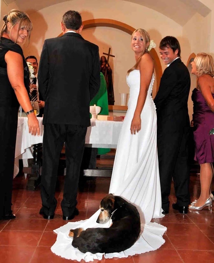 18. A kutyánk is ott volt az esküvőn, aki a szertartás közben úgy döntött, hogy menyasszonyi ruhámon helyezi magát kényelembe.