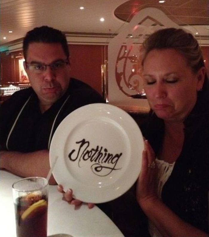 8. A pincér megkérdezte, hogy mit hozhat desszertnek, mire a feleségem azt válaszolta, hogy neki semmit. Így aztán amikor a pincér kihozta az én desszertemet, a feleségemnek is hozott egy tányért, amire csokisziruppal ráírták, hogy "semmi".
