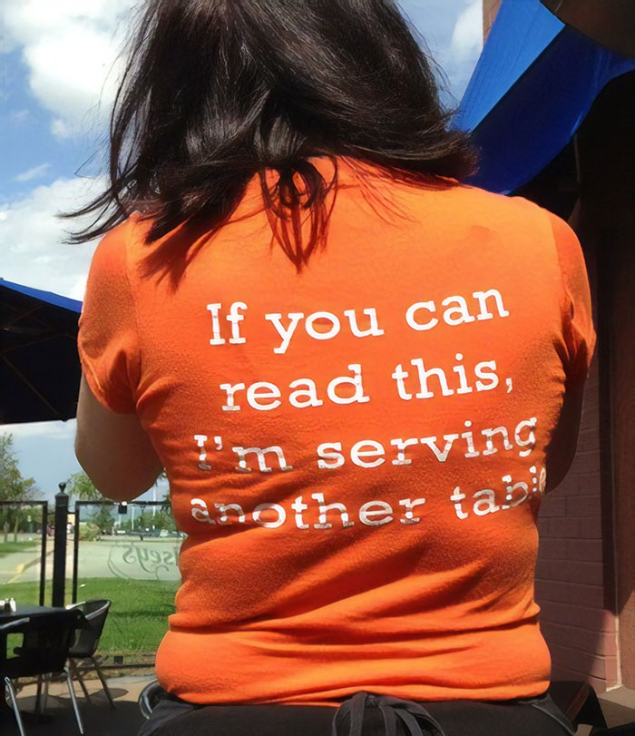 13. A pincérnő pólójára ez a szöveg volt ráírva: "Ha ezt el tudod olvasni, akkor éppen egy másik asztalt szolgálok ki."