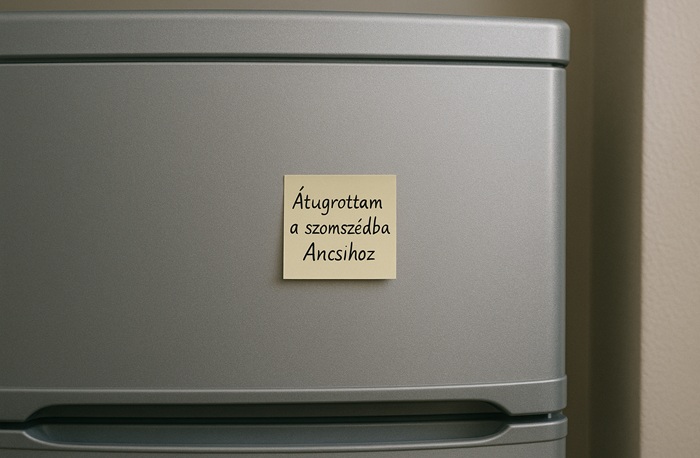 2. Amikor hazaértem a munkából, az a látvány fogadott, hogy a bejárati ajtó tárva-nyitva áll. Először megijedtem, hogy talán valaki betört a házunkba, de aztán megláttam a hűtőn egy cetlit a feleségemtől, hogy átugrott a szomszédhoz, és láthatóan elfelejtette bezárni az ajtót.