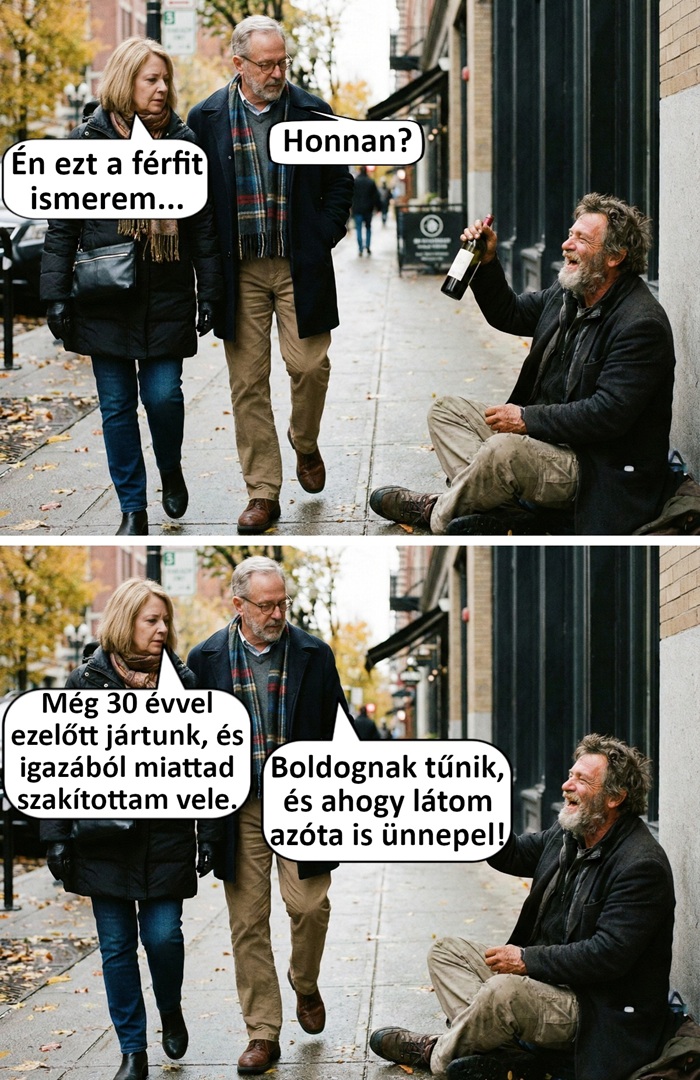 8. Az elmúlt években volt egy hosszabb betegségem, emiatt pedig sokat fogytam. A ruhaméretem 3 számmal kisebb lett, de új ruhákat nem tudtam venni magamnak, mert minden pénzemet a gyógyszerekre és az orvosokra költöttem. Így aztán egy jó ideig a régi, bő és elnyűtt ruháimban jártam. Úgy néztem ki, mint egy lecsúszott hajléktalan. Ilyen állapotomban egyszer véletlenül összefutottam az exemmel, aki erőltetett mosollyal az arcán azt hazudta, hogy jól nézek ki, majd becsúsztatott egy húszezrest a táskámba.