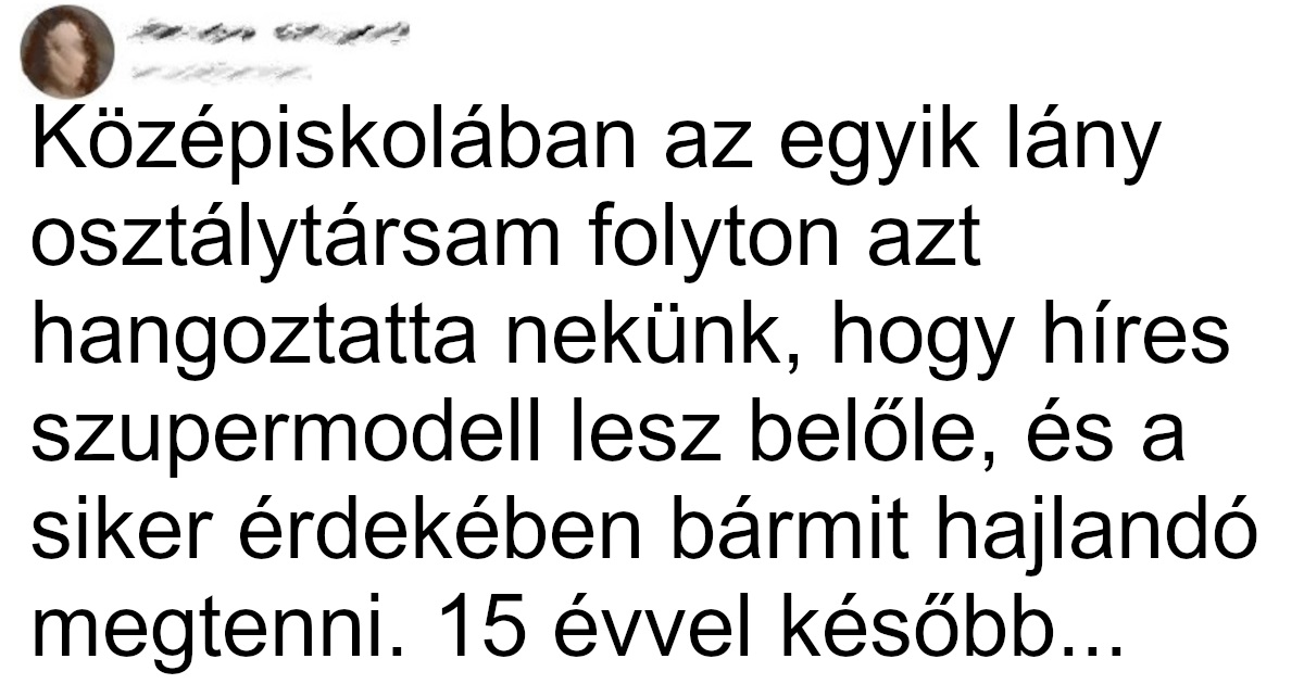 (7) Volt egy nagyon lusta osztálytársam. Soha nem készült az órákra, ezért bukdácsolt minden tantárgyból. Azt mondta nekünk, hogy semmi mást nem akar az életben, mint férjhez menni egy gazdag fickóhoz, és tévét nézni egész nap. Jó pár évvel később bemutatta a munkáit a Párizsi Divathéten, és világsztárok számára készít ruhákat. A Vogue Australia magazin egyik számában találtam egy róla, és a munkáiról készült cikket is.