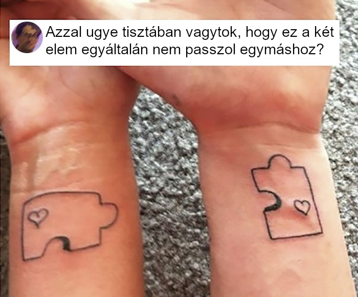 11. Ez a szerelmespár úgy döntött, hogy egy páros tetoválással fejezik ki az összetartozásukat. Büszkén mutatták meg a nagyvilágnak az elkészült tetoválásokat, ám egy kommentelő felhívta a figyelmüket egy aprócska hibára.