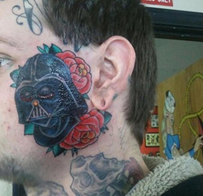 10. Egy Star Wars rajongó igazán "ízléses" tetoválást visel az arcán: Darth Vader vörös rózsák társaságában.