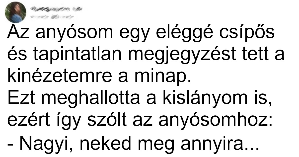(2) A kislányomat próbálom arra nevelni, hogy még a sértésekre is dicsérettel válaszoljon. Így történt meg a következő eset: Az anyósom egy eléggé csípős és tapintatlan megjegyzést tett a kinézetemre a minap. Ezt meghallotta a kislányom is, ezért így szólt az anyósomhoz: